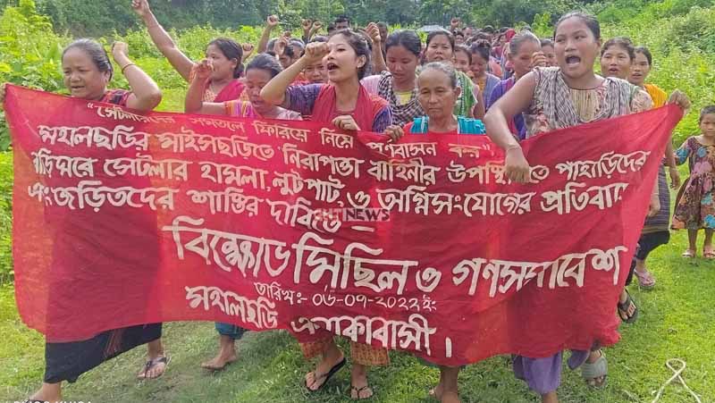 আজ বুধবার (৬ জুলাই ২০২২) ‘মহালছড়ি এলাকাবাসী’ ব্যানারে অনুষ্ঠিত বিক্ষোভ মিছিল পরবর্তী সমাবেশ থেকে অবিলম্বে হামলা ও অগ্নিসংযোগের সাথে জড়িত সেটলারদের গ্রেফতারের দাবি জানানো হয়।
