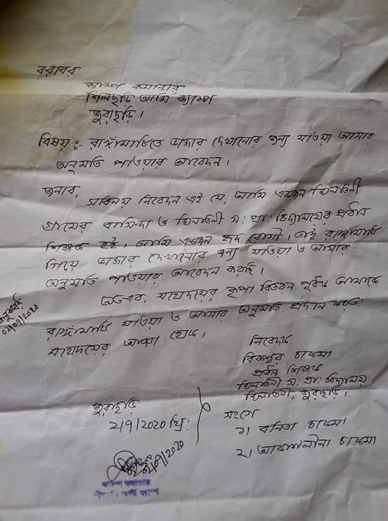 গত ২/৭/২০২০ খ্রি. তারিখে লেখা উক্ত আবেদনপত্রে তিনি লেখেন ‘ আমি একজন হৃদ রোগী। তাই রাঙামাটিতে গিয়ে ডাক্তার দেখানোর জন্য যাওয়া ও আসার অনুমতি পাওয়ার আবেদন করছি’।
